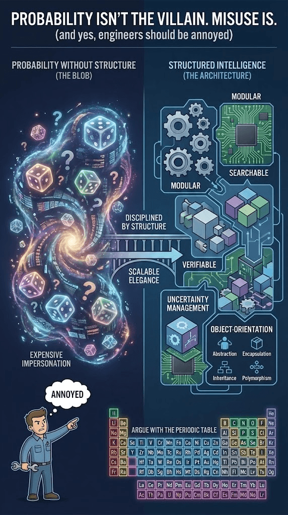 It will be probability doing what it’s supposed to do: uncertainty calculus inside a structured, modular, searchable, verifiable system—so capability can scale without turning compute into a bonfire.