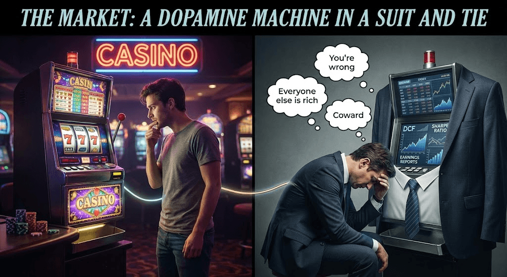 The cruelest part is the feedback loop. In a casino, every loss reminds you to stop. In the market, every day you sit in cash while it climbs feels like a loss — even though you haven't lost anything. The market charges you in regret — the most expensive currency there is. You can't quantify it, you can't hedge it, and it compounds faster than any stock.