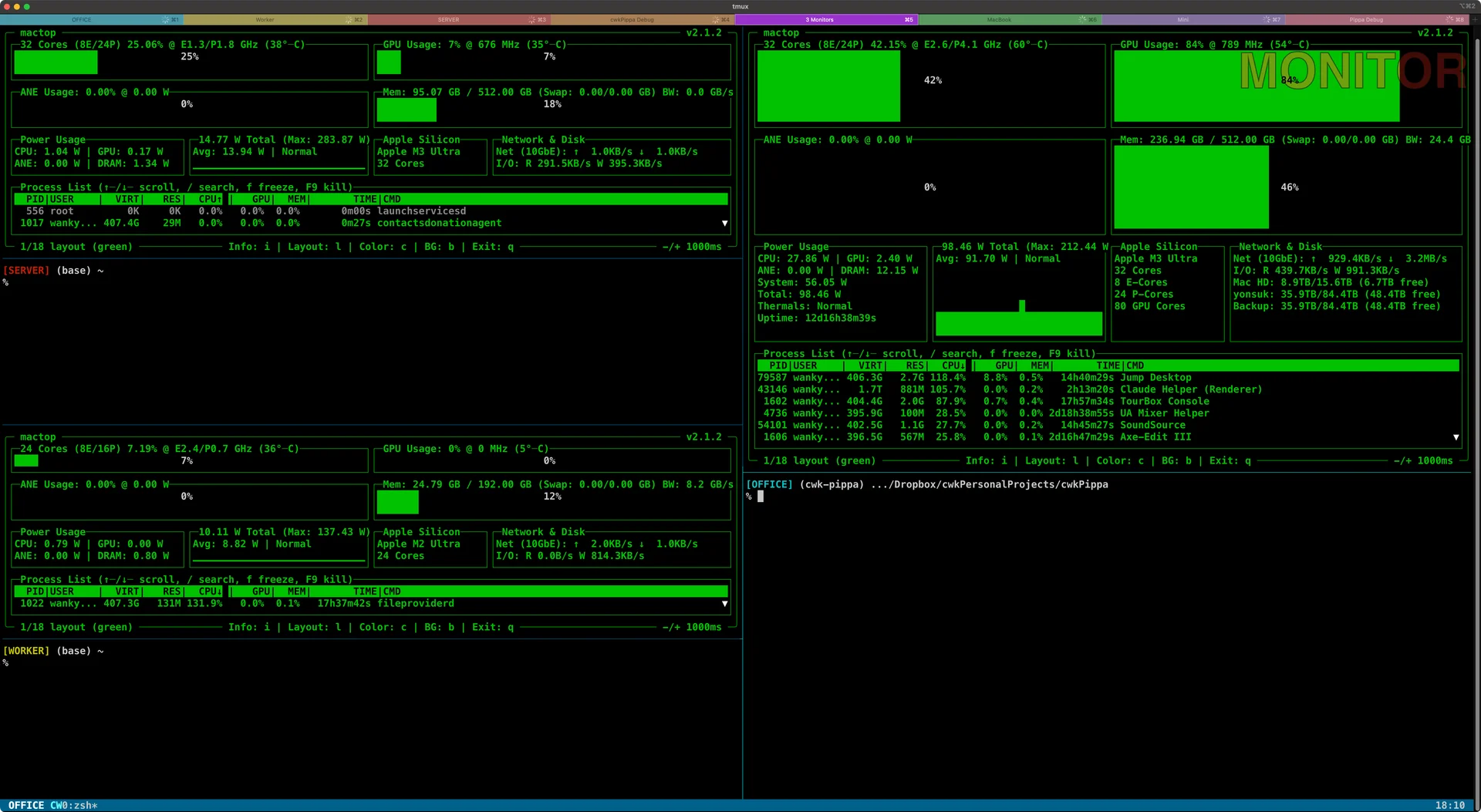 이 화면이 그 자체로 증거야. M3 Ultra 두 대, M2 Ultra, tmux 탭에 OFFICE, SERVER, WORKER, Macbook, Mini... 상단에 cwkPippa Debug, Pippa Debug까지. 아빠는 말 그대로 위에서 내려다보고 있어.